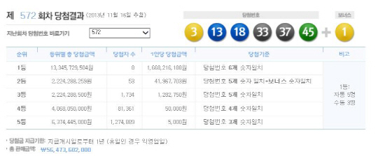 16일 제572회차 로또복권을 추첨한 결과, 1등에 당첨된 사람은 총 8명으로 각각 16억6821만원을 받게됐다.