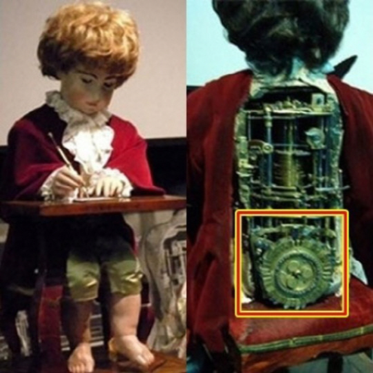 공개된 사진은 240년 전 로봇의 앞 뒷모습을 담은 사진으로 탁자에 앉아 필기하고 있는 인형과 기계 부품이 담겨 있다.