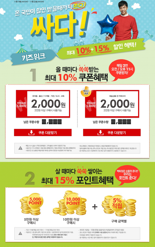 이밖에 11월 3째주를 키즈위크 기획전으로 선정하고 유아동, 출산, 디지털 가전, 도서 교육 카테고리 상품에 한해 매일 오전, 오후 11시 2천원 할인쿠폰도 발급한다(한정수량 5천장).