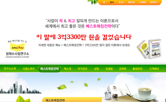 사업이 꼭 그리고 최고 잘되게 만드는 이론으로서 베스트매칭전략보다 더 좋은 것을 제보하는 첫 번째 사람에게 3억3300만원을 주겠다고 말하는 사람이 있다. 정재수 정재수사업연구소 소장이다.