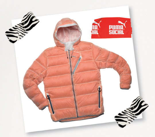 푸마 투명 구스 다운 재킷은 컬러풀하게 염색된 충전재와 속이 비치는 겉감 원단을 사용해 충전재 컬러가 옷감의 색처럼 보이는 신개념 점퍼다.