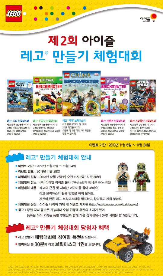 7세~초등 3학년 중 체험을 원하는 어린이는 누구나 신청 가능하며 24일까지 아이즐 네이버 카페 이벤트 게시판(cafe.naver.com/izzlebooks) 댓글에 자녀의 연령, 성별, 신청 사연을 기입하면 된다. 당첨자는 오는 28일에 발표되며 대회 참가 어린이 30명에게는 레고 브릭마스터 1권을 증정할 예정이다.