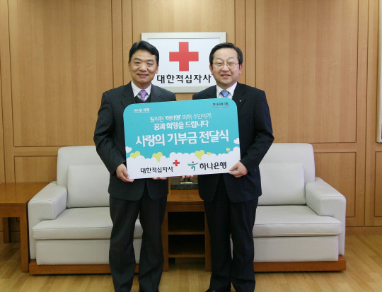 19일 오전 대한적십자사 사무실에서 김종준 하나은행장과 고경석 대한적십자사 사무총장 등이 필리핀 '하이옌' 피해 주민들에게 꿈과 희망을 드리기 위한 '사랑의 기부금 전달식'을 갖고 기념촬영을 하고 있는 모습. 김종준 하나은행장(사진 오른쪽), 고경석 대한적십자사 사무총장(사진 왼쪽).