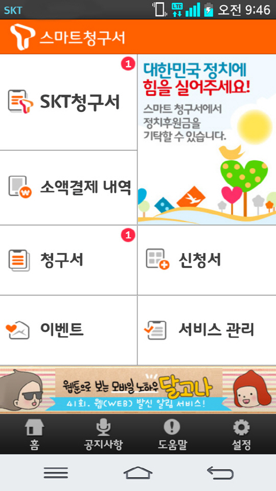 스마트청구서는 SK텔레콤이 지난 2011년 개발, 통신요금 상세내역과 소액결제 등 부가서비스 사용 내역을 알려주는 스마트폰 애플리케이션 형태의 전자청구서 서비스로, 유무선 통신, 전국 57개 자자체의 지방세와 교통범칙금 등 요금 청구서는 물론 자동차세 연납, 크레디트 카드, 렌터카 등 각종 신청서로 영역을 넓혀 토털 전자청구서 허브로 자리매김하고 있다.
