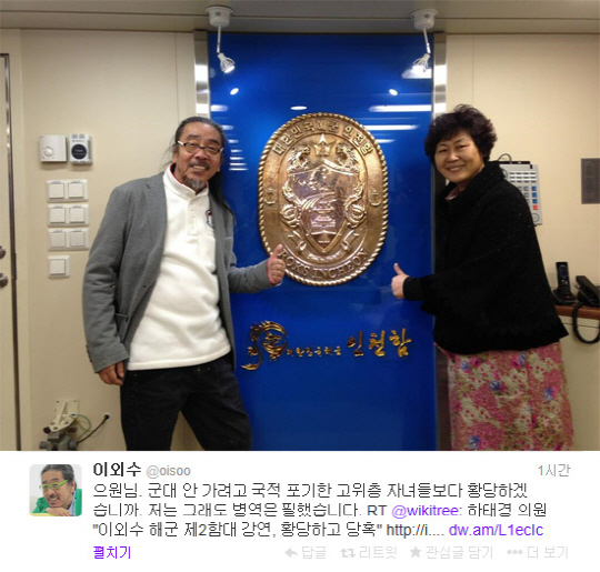 이어 하의원은 "천안함 잔해가 전시돼 있는 평택 2함대 사령부에서 천안함 폭침을 '소설'로 규정하고 '내가 졌다'며 조롱하던 이외수를 초청해 강연을 듣고 그것이 MBC '진짜사나이'를 통해 방송이 된다니"라면서 "이번 초청강연을 주선한 측과 그것을 승인한 제2함대 사령부 측에 모두 깊은 반성을 촉구한다"고 덧붙였다.