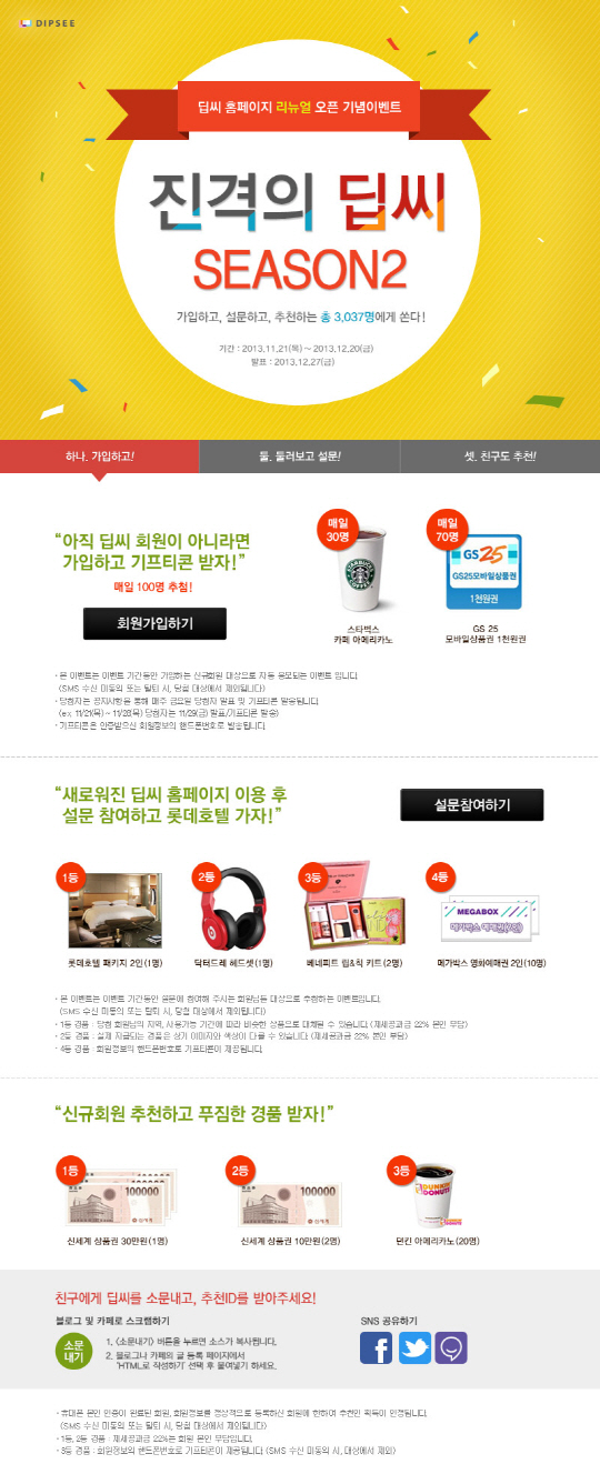 이번 이벤트는 세련된 디자인과 이용자 중심의 제작 환경으로 개편한 '딥씨' 브랜드의 고객지향적 이미지를 제고하기 위해 기획되었다. 고객들은 '딥씨' 홈페이지에 가입한 후, 설문에 참여하거나 친구들에게 추천받는 방법을 통해 본 이벤트에 응모할 수 있다. 이벤트 기간 동안 딥씨 홈페이지에서 신규 회원가입을 한 고객 중 매일 100명을 추첨하여, 한 달간 총 3,000명에게 프랜차이즈 커피 이용권과 편의점 상품권을 제공하고, 리뉴얼 홈페이지에 대한 설문조사와 친구 추천에 참여한 고객들 가운데 추첨을 통해 총 37명에게 유명 호텔 패키지부터 백화점 상품권까지 푸짐한 경품을 증정할 예정이다. 당첨자는 오는 12월 27일 홈페이지 이벤트 게시판에서 확인할 수 있다.