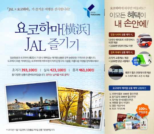 일본항공 홈페이지에서 확인할 수 있는 이번 상품은 '요코하마 JAL 즐기기' 라는 타이틀 아래 초특가, 실속, 품격 상품 등 3가지 레벨로 선보여 예산에 맞추어 선택할 수 있도록 하였다.