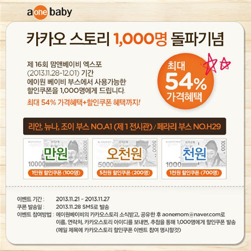 글로벌 유아용품 전문기업 ㈜에이원베이비가 카카오스토리 1,000명 돌파 기념으로 오는 11/28부터 12/1까지 일산킨텍스 제 1 전시관에서 진행되는 맘앤베이비 엑스포에서 사용가능한 할인쿠폰을 추첨을 통해 1,000명에게 증정하는 이벤트를 진행한다고 밝혔다.