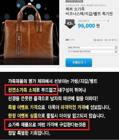 인조가죽 서류가방을 천연소가죽 제품인 것처럼 허위 광고한 소셜커머스 쿠팡에 대해 시정명령 및 과태료 1000만원이 부과됐다.