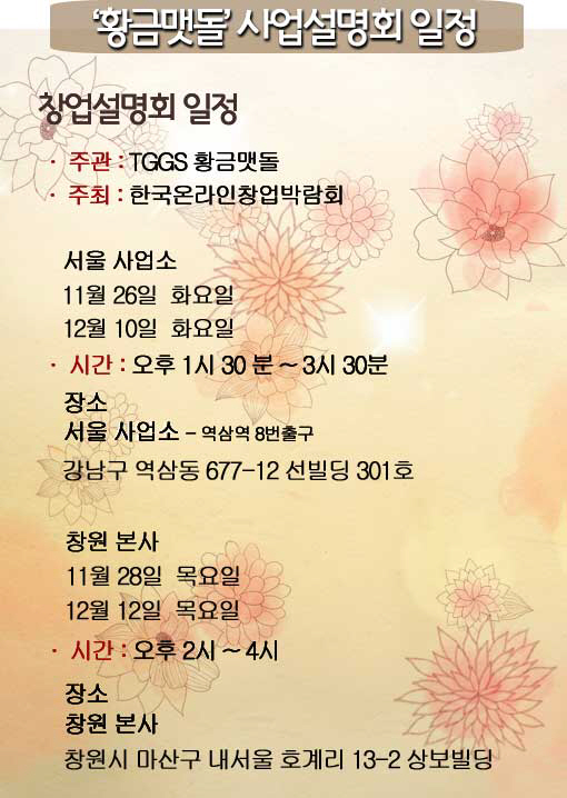 음실물분쇄기업계의 선두주자 TGGS 황금맷돌은 11월과 12월에 걸쳐 네차례의 사업설명회를 진행한다.