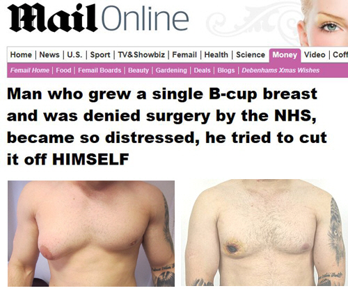 한쪽 가슴이 B컵 사이즈인 남성이 스스로 절제하려다 병원신세를 졌다는 소식이 전해져 화제다.