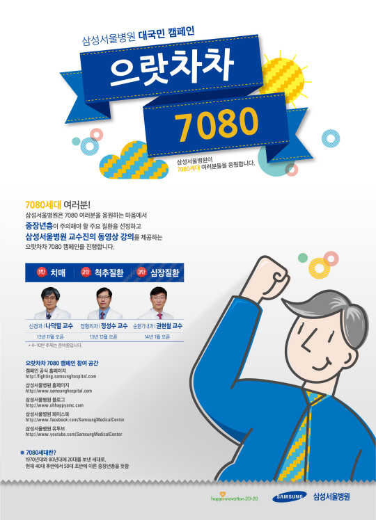삼성서울병원 명의들이 전하는 건강강좌를 온라인에서 손쉽게 만나볼 수 있는 길이 열렸다. 삼성서울병원은 오는 25일부터 '으랏차차 7080 캠페인'을 전개한다고 밝혔다.