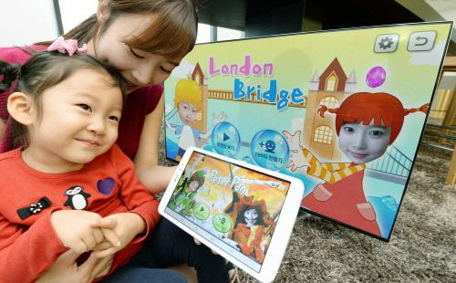 | ◇ LG전자모델이 아이와 함께 LG 스마트 TV와 G 패드 8.3을 통해 가족용 애플리케이션 '아바트 북'을 이용하고 있다. |