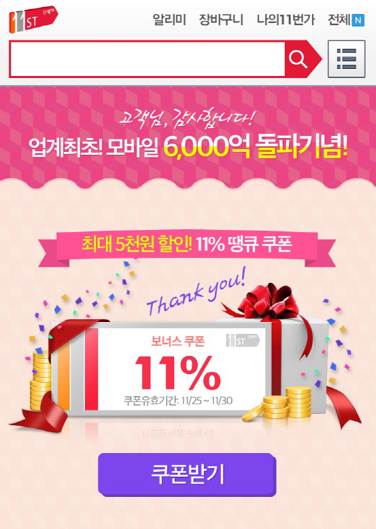 11번가는 모바일 쇼핑의 직관성을 높이고 주요 생필품을 보다 편리하게 구매할 수 있도록 '바로마트' 코너를 신설했다. 또 11번가는 모바일쇼핑 대세감을 이어가기 위해 개인화된 쇼핑 정보를 제공하는 '알리미', 고객 소비패턴 분석을 통한 타임쿠폰, 첫 구매 할인, 금융혜택 등을 운영한다. 오는 30일까지 '모바일 쇼핑 1등' 기념 고객감사 이벤트로 전 고객에게 모바일 11% 할인쿠폰을 발급해준다.