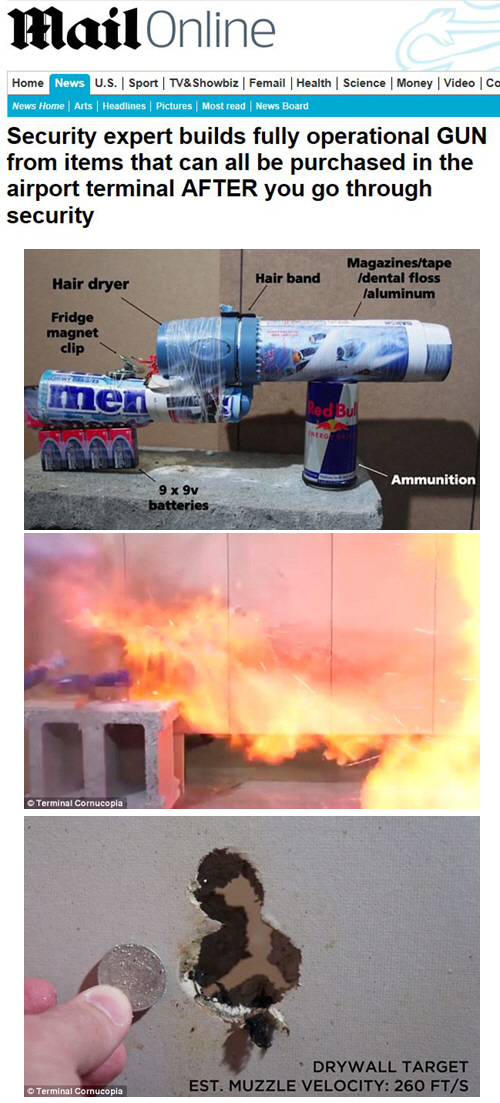 25일(현지시간) 영국매체 데일리메일에 따르면 미국 노스캐롤라이나 그린즈버로에 거주하는 보안전문가 에반 부스씨가 공항내 가게에서 산 재료를 이용, 사제총기를 만들어 발사 시연했다.