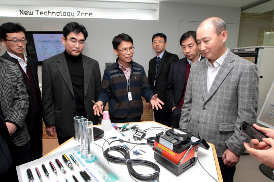 ◇KT 네트워크부문장 오성목 전무와 관계자들이 27일 우면동 KT 연구개발센터 3층에 위치한 유선네트워크 '라스트 원 마일 센터 ' 전시관 내 뉴 테크놀로지 존에서 광케이블 신기술 분야에 대해 설명을 듣고 있다.