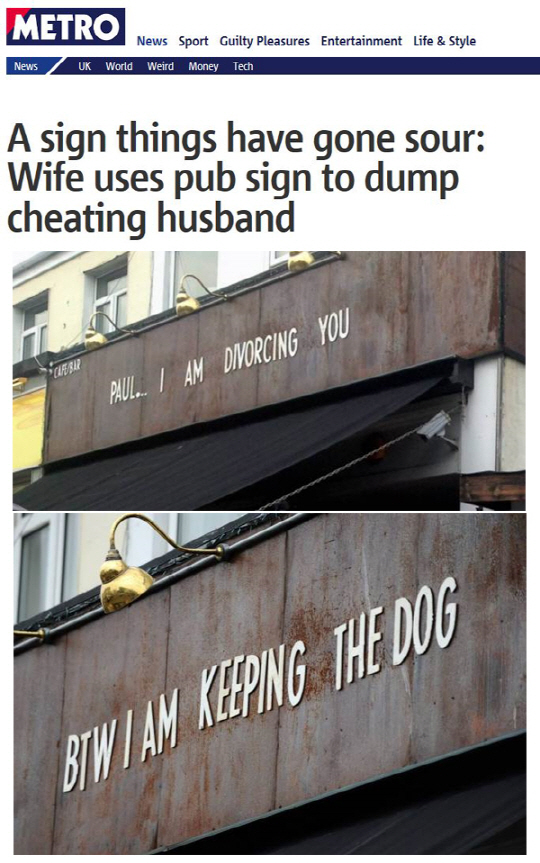 26일(현지시간) 영국매체 메트로에 따르면 웨일스 남부 스완지시티 시내에 있는 한 술집 간판에 '폴, 나는 당신과 이혼하려 해'라는 문구가 달려 있었다. 다음날에는 '그런데 개는 내가 키울 예정이다'라는 글이 올라왔다. 문구는 자석으로 만들어져 쇠로 된 간판에 부착한 것으로 알려졌다.