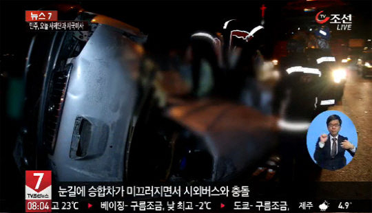 승합차가 눈길에 미끄러지면서 중앙분리대를 넘어 마주오던 5톤 화물차와 부딪힌 뒤 뒤따라오던 시외버스와 충돌한 것. 이 사고로 승합차에 타고 있던 37살 김 모씨 등 여섯명 모두 숨졌고, 시외버스에 타고 있던 승객 19명도 다쳐 인근 병원으로 옮겨져 치료를 받고 있다.