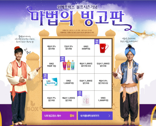 소셜커머스 위메프(대표 박은상, www.wemakeprice.com)의 해외 배송대행 서비스인 위메프 박스는 블프 이벤트 기간(2013년 11월 21일~2014년 1월 1일) 동안 마법의 빙고판 이벤트를 실시, 결제 한 건당 빙고칸을 채울 수 있는 스탬프를 발급한다. 빙고 완성 수에 따라 배송비 20% 쿠폰, 1만원 할인 쿠폰 등의 혜택을 받을 수 있다. 빙고판 이벤트와 함께 묶음배송 무료, CA부피 무게 면제 등도 실시하여 더욱 저렴하게 해외 직구를 즐길 수 있다.