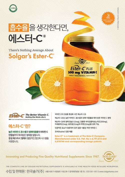 가장 먼저 국내에 에스터C 비타민을 도입한 솔가 비타민은 솔가 회원들의 요청으로 한국 식약청 기준에 맞춰 소량 주문, 별도 생산하여 국내에 수입 하고 있다.