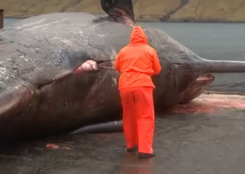 그가 칼로 고래의 배를 가르자 폭발음과 동시에 고래의 내장이 쏟아졌다.