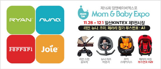 이외에도 이번 '제16회 맘앤베이비 엑스포'에 영국5성급 카시트 '조이(Joie)'를 비롯해 대한민국 1등 완판 유모차 '리안(RYAN)', 네덜란드 유아용품 브랜드 '뉴나(Nuna)', 아빠들의 로망 Made in France '페라리(Ferrari)' 카시트를 착한 가격과 다양한 혜택으로 선보인다.