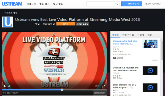 유스트림(대표 김진식)이 11월 20일(미국 현지 시간 기준) '스트리밍미디어닷컴(StreamingMedia.com)의'의 '2013 스트리밍 미디어 리더스 초이스 어워즈(2013 Streaming Media Readers' Choice Awards)'에서 수상자로 선정됐다.