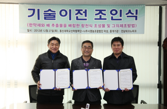 ◇덕성영농조합 동신대학교산학협력단과 기능성배즙 특허이전 개발사업
