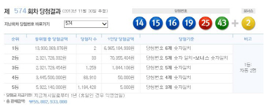 지난 30일 제574회차 로또복권을 추첨한 결과, 1등에 당첨된 사람은 총 2명으로 각각 69억6518만원을 받게됐다.