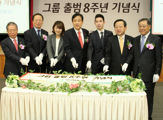 | ◇2일 오전 외환은행 본점 4층 대강당에서 열린 하나금융그룹 출범 8주년 기념식에서 김정태 하나금융그룹회장(왼쪽에서네번째)을 비롯한 임직원들이기념떡 커팅을 하고있다. |