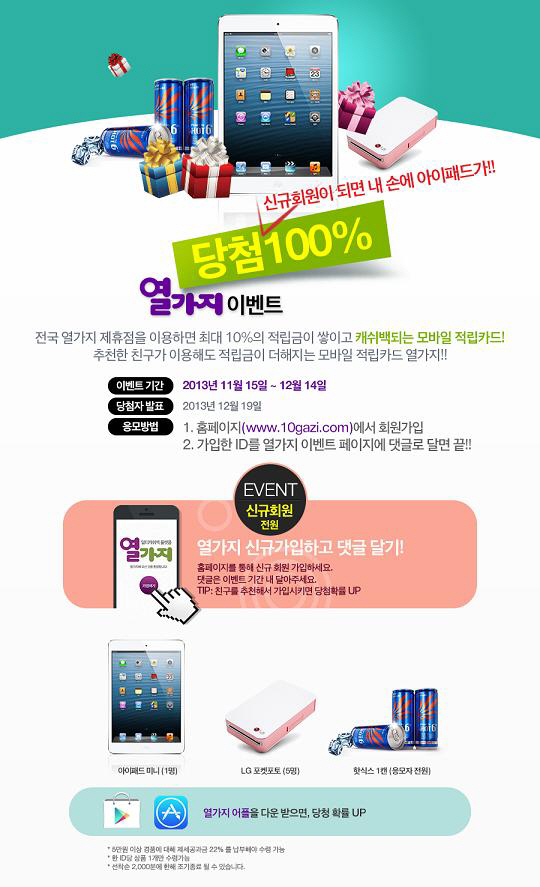 '열가지는' 최근 신규 회원을 대상으로 하는 100% 당첨 이벤트를 전개, 관심을 모으고 있다. 이번 열가지 이벤트는 12월 14일까지 진행된다. 열가지 홈페이지(www.10gazi.com)에서 회원가입한 후 가입 ID를 열가지 이벤트 페이지에 댓글로 달면 자동 응모된다. 이벤트에 응모한 신규 회원에게는 아이패드 미니, LG포켓포토 프린터, 핫식스 등의 푸짐한 경품이 증정된다.