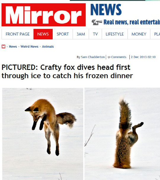 야생 붉은 여우가 눈 바닥에 거꾸로 처박힌 모습이 포착돼 화제다.