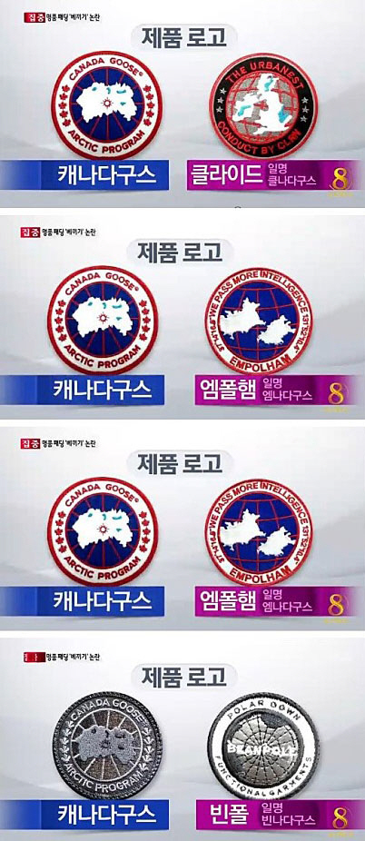 '코리아구스'로 불리는 카피 제품들은 캐나다구스 로고가 북극해를 상징하는 지도임에 반해 영국지도, 독도 등을 넣은 비슷한 로고를 부착했고, 심지어 캐나다구스 로고가 새겨진 바느질 패치만 따로 판매하는 전문 쇼핑몰도 등장하고 있다.
