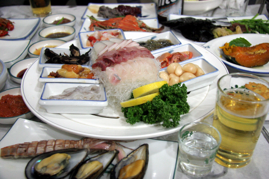 6만원(2인 기준)이면 소주(한 병에 1만원)와 맥주(한 병에 6000원)를 얼음이 담긴 파란 플라스틱 통에 섞어 담아 내온다. 굴, 멍게. 호래기. 방어회, 볼락, 전갱이 등 생선구이, 가자미 튀김 등 한상 가득 채워진 해산물 안주가 기본으로 나온다.