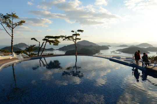통영의 진풍경을 감상할 수 있는 포인트가 있다. 통영시 산양읍 미남리 수산과학관 위편에 자리 잡은 '클럽 이에스 리조트 통영'이 바로 그곳이다. 리조트 위쪽 수영장에서 바라본 한려수도는 그야말로 장관이다. 바닷물과 맞닿은 듯 한 수영장 위로 짧은 겨울 오후 해가 쉬어 가고, 그 속에 투영된 소나무의 자태도 멋스럽다. 시선을 바다로 돌리면 비진도, 욕지도, 거제도 등 한려수도의 섬 풍광이 시원스레 펼쳐져 절로 탄성이 터져 나온다.