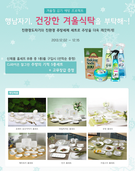 행남자기는 신제품 홈세트 구매 고객에게 겨울철 건강한 식기 관리를 위해 CJ라이온의 주방세제 참그린 주방의 기적 5종 세트(3만원 상당)와 고무장갑을 증정한다. 참그린 주방의 기적 5종 세트는 기름기 제거, 찌든때 제거, 항균 스프레이, 탈취 스프레이, 프리미엄 베이킹 소다 총 5종이 세트로 구성돼 있다. 이번 선물 증정 행사는 30개 한정 수량이며 선착순 마감 시 조기 종료된다.