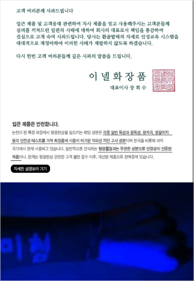 한편 '형광비비' 논란은 이넬화장품 고객센터 직원과 팀장이 '형광비비'와 관련해 별 문제 아니라는 장난 섞인 태도로 응대하는 것에서 일어났다.