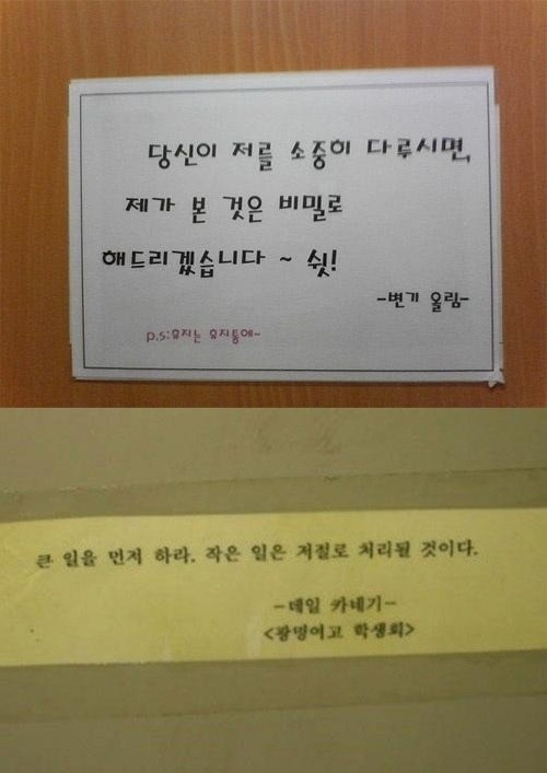 화장실 명언 가운데 가장 공감을 얻고 있는 문장은 "큰일을 먼저 하라. 작은 일은 저절로 처리될 것이다"라는 데일 카네기의 명언이다.
