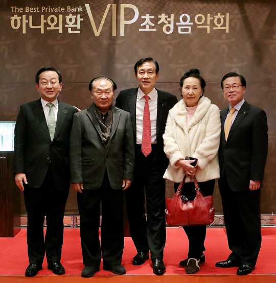 ◇하나금융그룹 소속 하나은행과 외환은행은 4일 저녁 서울 올림픽공원 올림픽홀에서 고객들께 감사의 마음을 전달하는 의미로 양은행 2천여 명 고객을 초청해 '하나외환 VIP 초청 음악회'를 공동으로 개최했다. 김정태 하나금융그룹 회장(사진 왼쪽에서 세번째), 김종준 하나은행장(왼쪽에서 첫번째), 신현승 외환은행 부행장(왼쪽에서 다섯번째)이 음악회에 앞서 초청된 고객들과 인사하며 기념촬영하고 있는 모습
