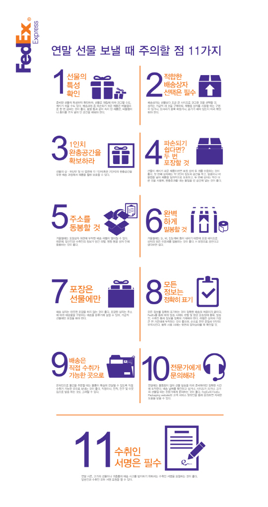 세계 최대의 항공 특송 회사인 FedEx는 연말을 맞아 선물을 보낼 때 주의할 점과 유용한 팁 11가지를 담은 인포그래픽을 공개했다.