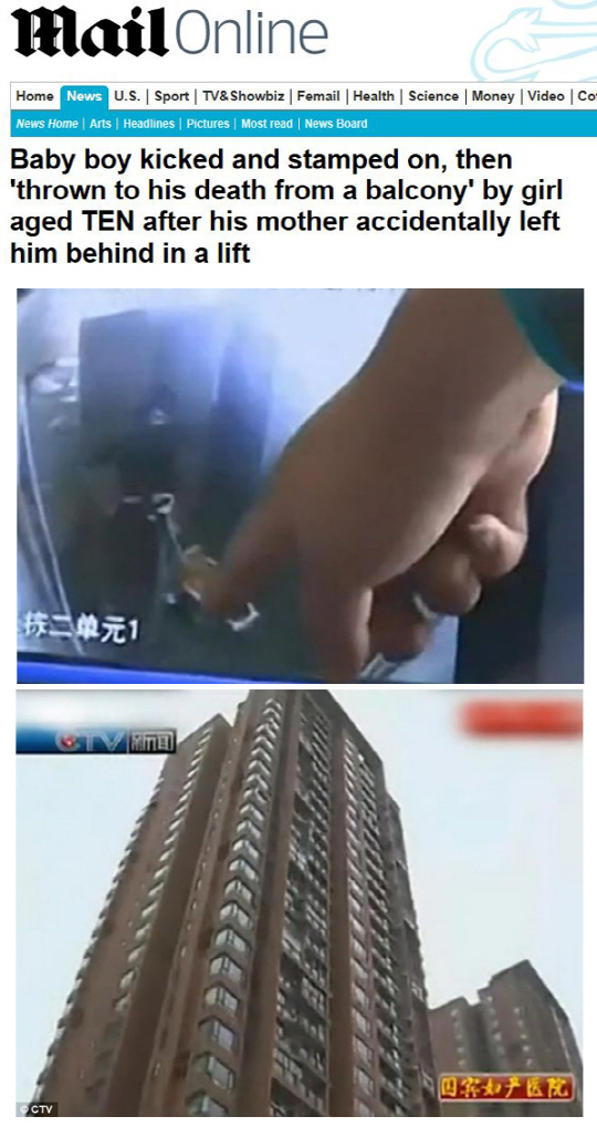 중국에서 여자 초등학생이 무차별 폭행한 갓난 아기가 25층 높이에서 떨어져 사망한 사건이 발생해 충격을 주고있다.