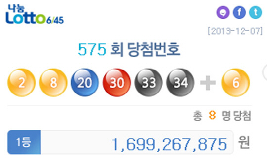 1등 당첨자는 8명으로 각 16억 9926만 7875원의 당첨금을 받게 됐다.