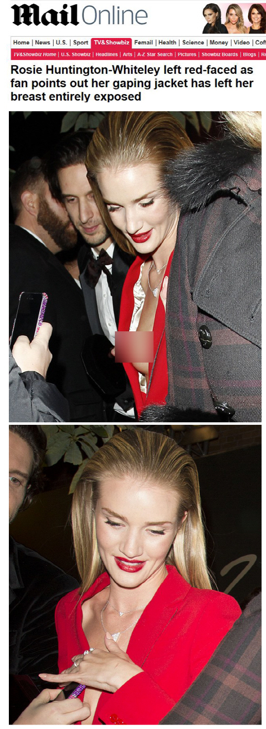 모델 겸 영화배우인 로지 헌팅턴 휘틀리(26)가 가슴이 노출되는 사고를 당했다.