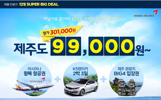 정상가 대비 최대 67% 할인가인 9만9000원에 판매하는 이벤트다. 총 30만원 상당의 '아시아나 왕복항공권', '중형차 렌터카 이용권', '제주 관광지(4곳) 입장권'이 포함됐다.