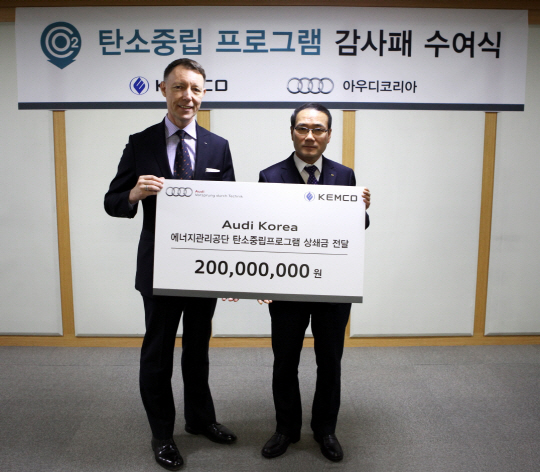 아우디 코리아는 사회공헌 활동의 일환으로 지식경제부와 에너지관리공단이 시행하고 있는 '탄소중립 프로그램'에 참여해 이산화탄소 상쇄금 2억원을 에너지관리공단에 전달했다고 9일 밝혔다.