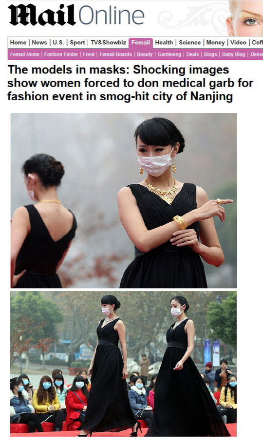 8일(현지시간) 영국매체 데일리메일에 따르면 지난주 중국 난징시의 한 야외 패션쇼에서 모델들이 마스크를 착용한 채 무대에 오르는 웃지못할 광경이 펼쳐졌다. 또한 이를 지켜보는 관람객들도 마스크를 착용해 미세먼지의 심각성을 보여줬다.