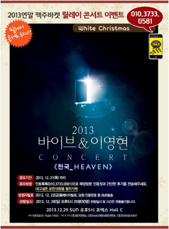 맥주바켓이 연말을 맞아 이달 23일까지 '2013 연말 릴레이 콘서트 이벤트'를 진행한다. '2013 연말 릴레이 콘서트 이벤트'는 맥주바켓 매장 방문 고객들을 대상으로 한다. 추첨을 통해 바이브&이영현 콘서트 '천국_ HEAVEN'(50명), 장기하와 얼굴들의 '내년에는 꼭 3집 내겠습니다'(60명), 글렌체크의'Young Generation'(70명) 공연 티켓을 증정하는 이벤트다.
