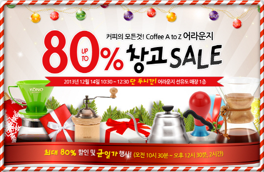 커피 전문 유통 브랜드 어라운지가 오는 14일 국내외 인기 브랜드 커피 용품을 최대 80% 할인된 가격에 구입할 수 있는 특별 창고 세일을 실시한다.