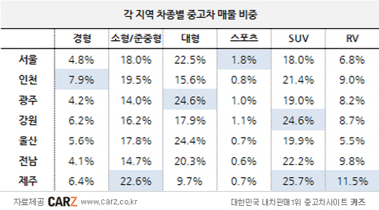 카즈 관계자는 "제주와 강원은 지형적 요인으로 SUV 비중이 높은 것으로 추측된다. 두 지역은 각각 해안 및 산간지형으로 오프로드 주행이 많아 SUV 매물이 많은 것으로 보인다"고 밝혔다.