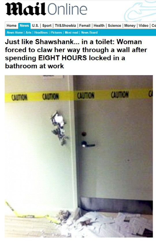 영화 '쇼생크 탈출'처럼 벽을 뚫어 탈출한 여성의 사연이 공개돼 화제다. 영화와 다른 점은 감옥이 아닌 화장실에서 벌어졌다는 것.